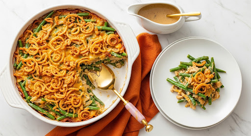 Flavor Profile – Tender green beans are enveloped in a luscious sauce infused with slow-caramelized onions, creating a deep, golden sweetness balanced by the umami richness of vegetable broth and toasted mushroom undertones. A hint of thyme and cracked black pepper lend rustic, herbaceous notes, while a light cashew-cream béchamel adds velvety smoothness.