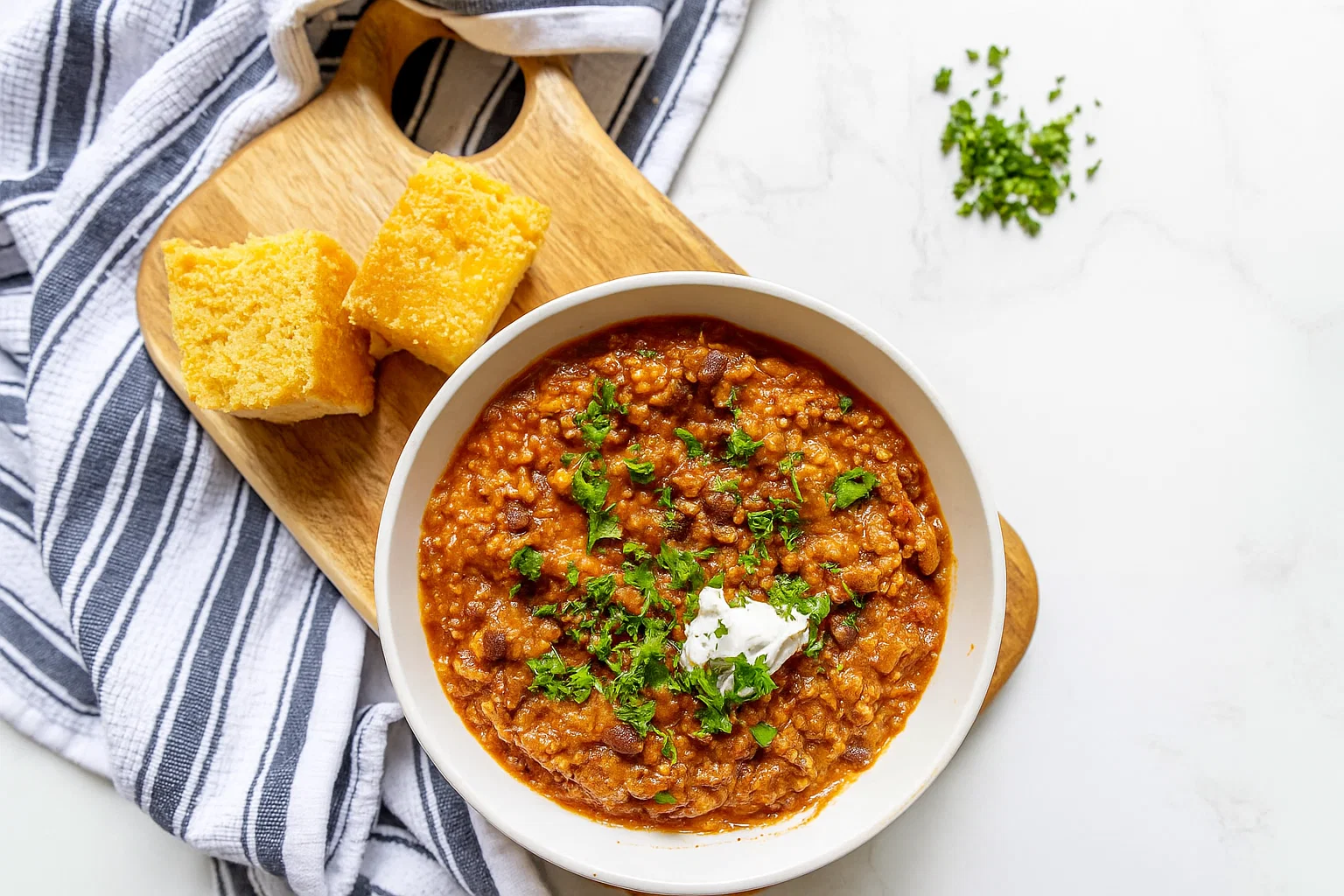 FLAVOR PROFILE – “Your taste buds are welcomed by the tender, hearty bite of ‘BEAF’, mingling with creamy beans in a rich, tangy tomato base. Gentle spices add warmth without heat, while subtle smoky undertones provide depth and balance. A dollop of tofu sour cream on top lends a cool, silky finish with a light tang, perfectly complementing the savory umami of the chili. The result is a smooth, comforting, and full-bodied dish that satisfies without overwhelming the palate.”